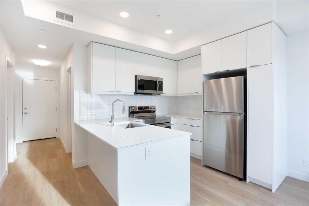 Welcome to this brand-new contemporary condo in the heart of East Hills Crossing, where sophisticated style meets effortless urban living. This thoughtfully designed 642 sq. ft. residence maximizes every inch of space, blending high-quality finishes with a functional layout that feels both airy and expansive. Upon entering, you are greeted by a bright and inviting ambiance defined by a neutral color palette and warm luxury vinyl plank flooring. The heart of the home is a stunning kitchen, where sleek quartz countertops and a dedicated breakfast bar provide the perfect setting for morning coffee or evening entertaining. The kitchen flows seamlessly into the open-concept dining and living area, fully equipped with a premium stainless steel appliance package. From the living room, step out onto your private, covered balcony—a perfect retreat for enjoying the fresh air regardless of the season. The primary suite serves as a true sanctuary, featuring an oversized walk-in closet and a luxurious four-piece ensuite complete with a deep bath for ultimate relaxation. The second bedroom is generously sized and versatile, ideal for a guest room or a home office, and is conveniently located near the main three-piece bathroom, which boasts a large walk-in shower. Modern convenience is integrated throughout, with a dedicated in-suite laundry and storage room, along with a titled underground parking stall to keep your vehicle secure and warm. Beyond the unit, the building offers exceptional lifestyle amenities, including a vibrant rooftop patio and communal gathering spaces designed for socializing with neighbors. Located directly across from East Hills Shopping Centre, you are steps away from groceries, dining, entertainment, and everyday essentials. Whether you are a first-time homebuyer, a savvy investor, or looking to downsize into a vibrant, up-and-coming community, this condo offers unparalleled convenience and modern charm. Don’t miss your chance to experience East Hills living—book your showing today! MLS®: A2274795 - Belvedere Apartment-Single Level Unit $299,900